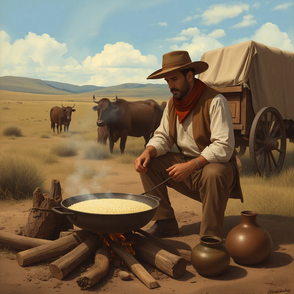 O arroz carreteiro gaúcho tem raízes profundas na história do Rio Grande do Sul, remontando aos séculos XVIII e XIX, época em que os carreteiros — tropeiros responsáveis pelo transporte de cargas em carretas puxadas por bois — cruzavam as vastas planícies do pampa. Sem geladeiras ou conservas modernas, esses trabalhadores da estrada usavam o charque, uma carne bovina salgada e seca ao sol nas charqueadas, como principal fonte de proteína. Para uma refeição rápida e nutritiva, coziam o arroz diretamente no guisado de carne, em panelas de ferro sobre fogo de chão.